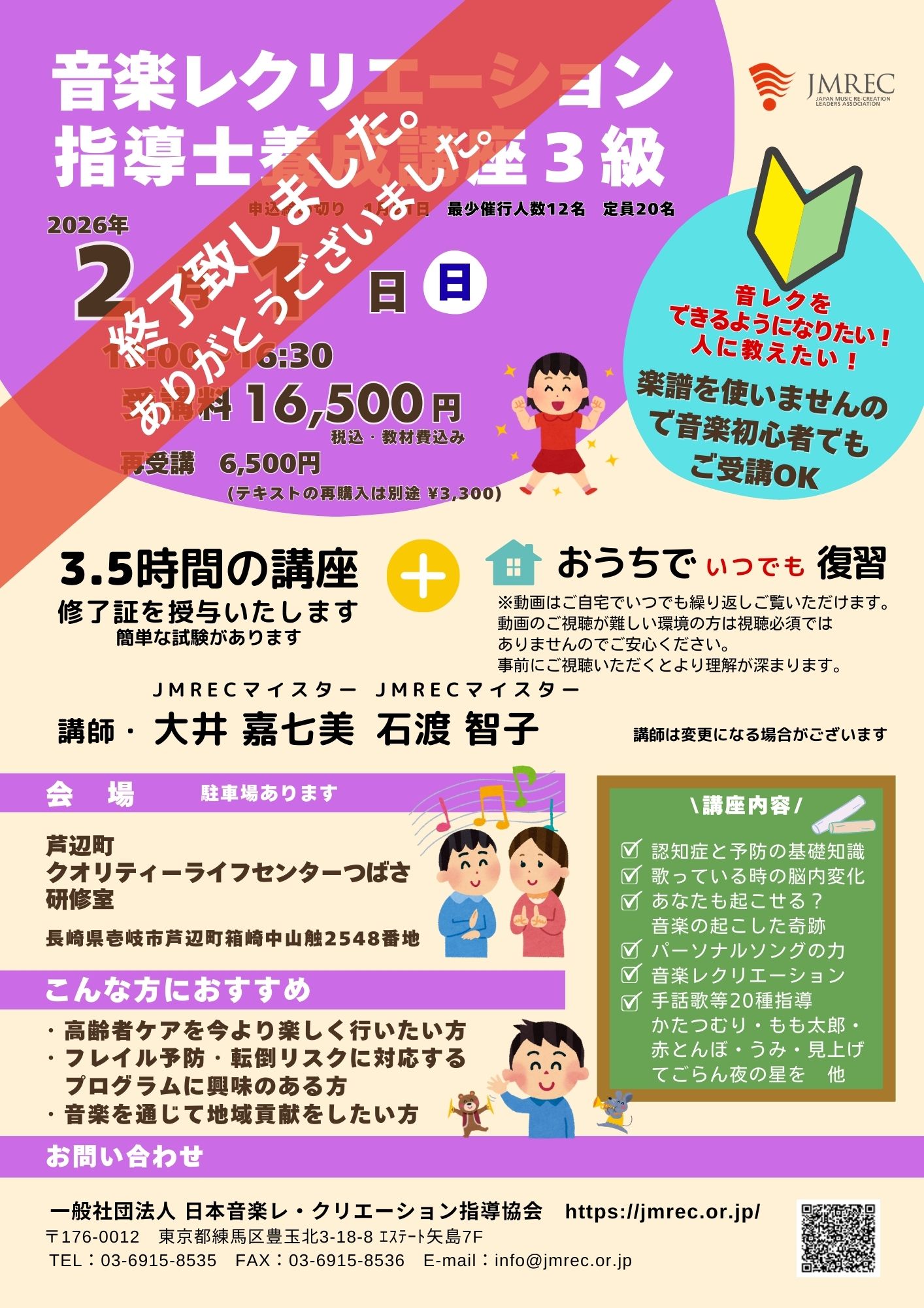 音楽レクリエーション指導士養成講座3級を受講、修了試験に合格し、入会手続き後に認定資格証が与えられます。そして音楽レクリエーション指導士3級としてJMRECに会員登録されます。