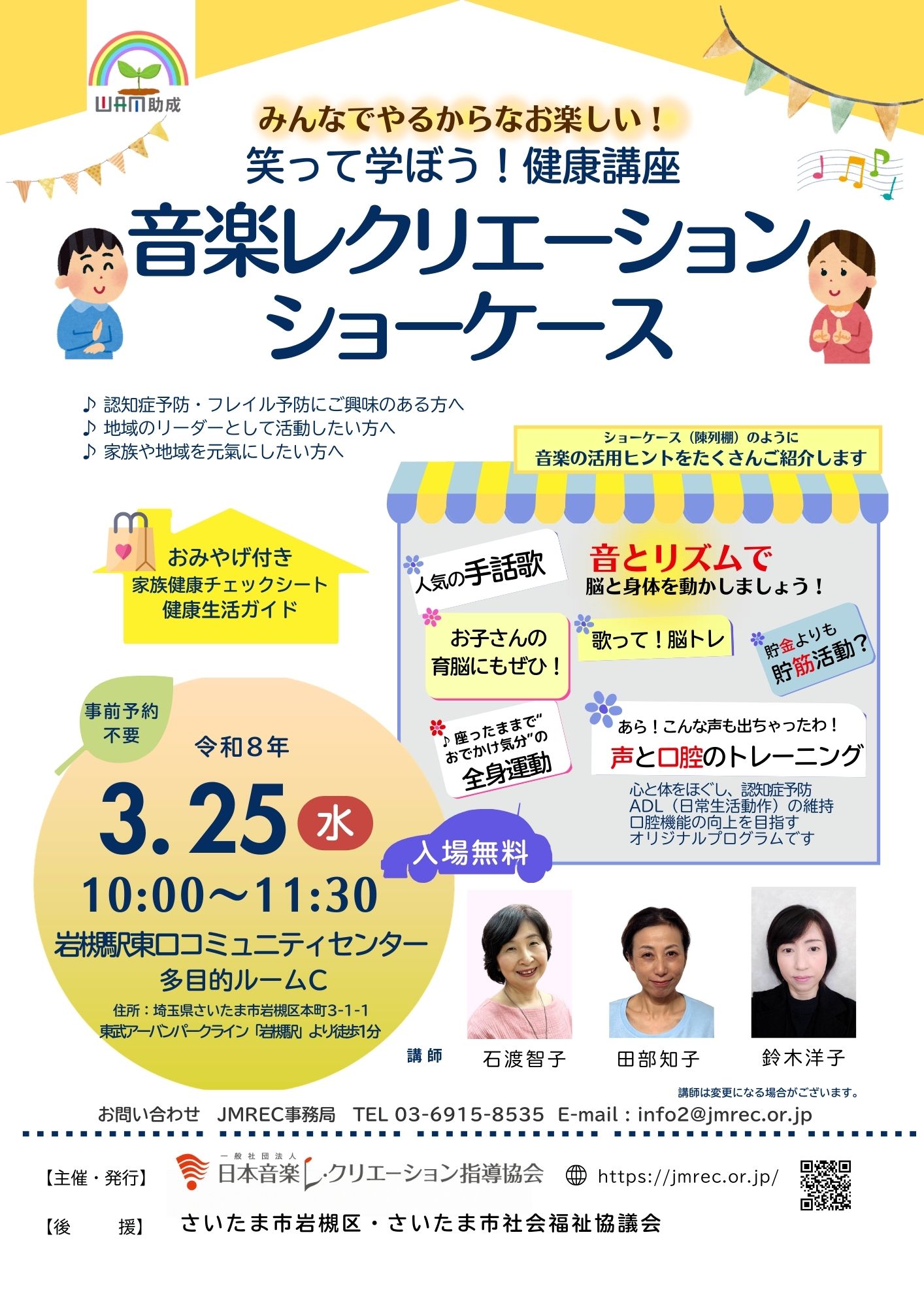 多様化した時代に個人の嗜好は様々です。自分に合った健康法を音楽レクリエーションで探すた めにショーケース(陳列棚)と名付けて、様々な音楽レクリエーションの楽しみ方をご紹介する催 しです。 この催しは独立行政法人福祉医療機構の社会福祉振興助成事業としてJMREC主催、さいたま市岩槻区・さいたま市社会福祉協議会の後援で実施いたします。