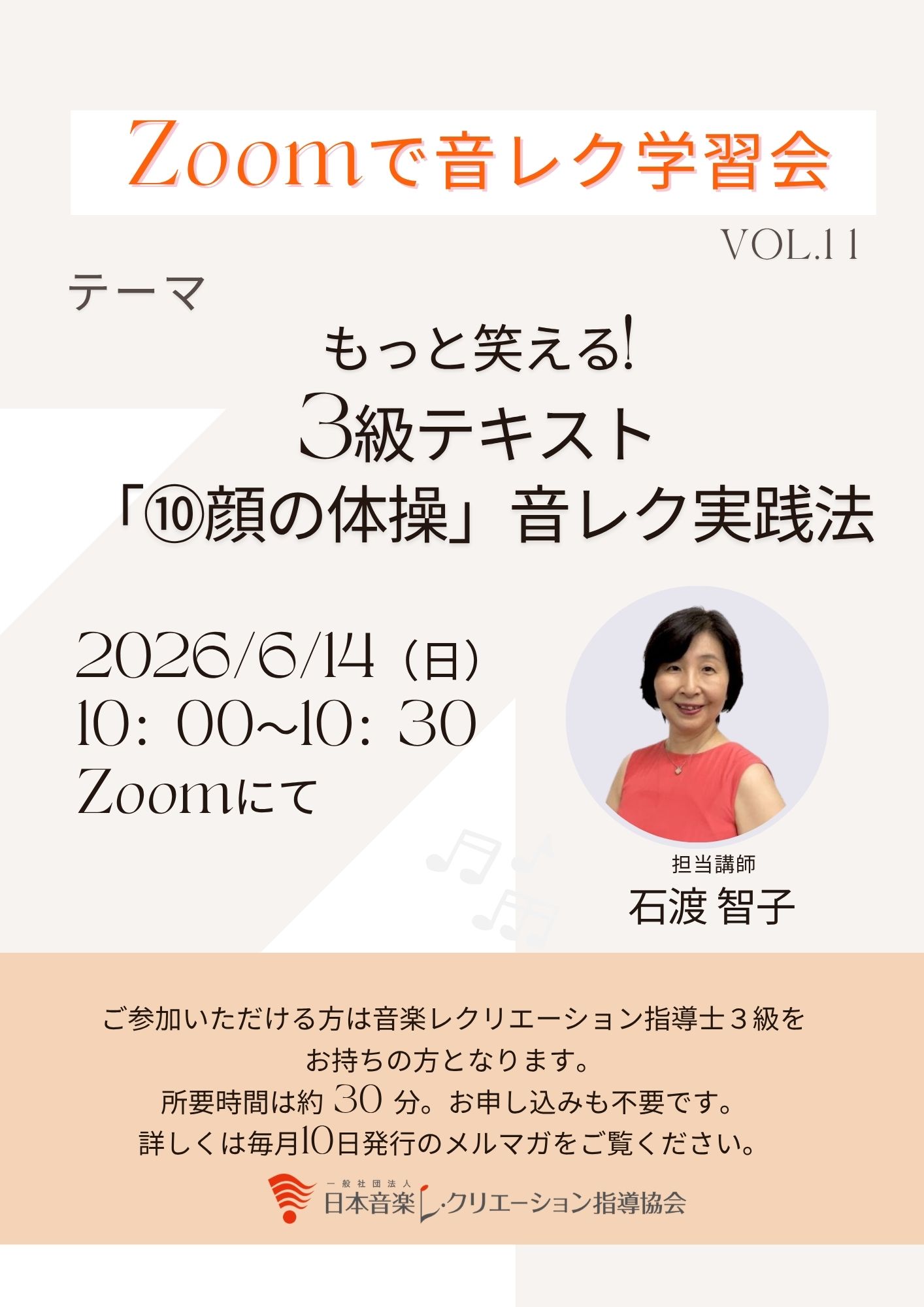 第11回 2026/6/14(日) 10:00~10:30 テーマ :もっと笑える!3級テキスト「⑩顔の体操」音レク実践法〜表情〜発声〜口腔訓練まで 担当講師:石渡智子
